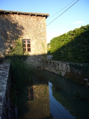 Three new granges were built on the south-east side of the chateau at right-angles to it. These are large two-storey structures which served a variety of uses. They are not on the 1825 map and their appearance and construction match the new work on the chateau itself. It is pretty certain they were all built in the same years. Most outbuildings attached to chateaux in this area were laid out in a similar way. In this case a courtyard was created between the western and central granges by digging and walling in a short “moat” parallel to the road, with a small bridge in the centre to allow access. High stone gate piers made of large blocks of smooth-faced stone and quite elaborate moulded capstones were put up on the road side of the bridge, supporting a pair of high but quite plain iron gates. Until recently these gates and posts stood in isolation – no walls or railings were added to connect them to the granges on each side. But about 30 years ago a beech hedge was planted which now makes a good barrier.