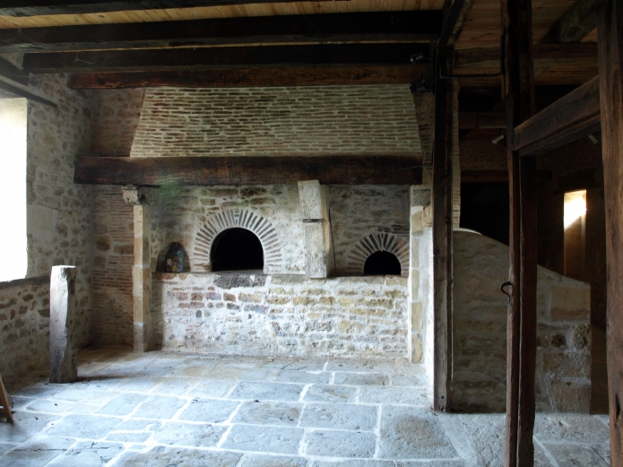 With its new granges (also known as communs when used to support the domestic routine of the house) the chateau must have been largely self-sufficient. Most of the 19th century features are still evident. The western building, which is rather narrower than the other two, contains a bakery with large and small ovens, which was heavily used judging by the blackened timbers and brickwork. This area, in the centre of the building, was impressively renovated by Michel Fraboulet c. 2002 while he lived at the chateau with Mme Clochet. M. Fraboulet also carefully repaired the rest of the ground floor interior of this grange, which also included two large former storage areas; a six-seater earth latrine (since converted into a heating equipment room); and what is said to have been the village lock-up - all to provide extensive gallery space for Mme Clochet’s paintings. M. Fraboulet also renovated the coachhouse and farrier’s forge at the north-western end of the central grange. The rest of this central building consisted of stabling, a tack room, and possibly the coachman’s lodge. Mme Clochet converted the latter area into accommodation for a caretaker in 2006, and it was further modified by the present owners to form a gite for people to stay in.
